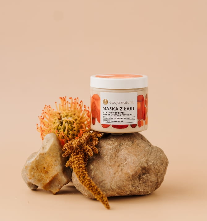 Naturalna maska do włosów suchych i matowych – Granat & Trawa Cytrynowa. Nawilża, regeneruje i wygładza, przywracając włosom blask i miękkość.